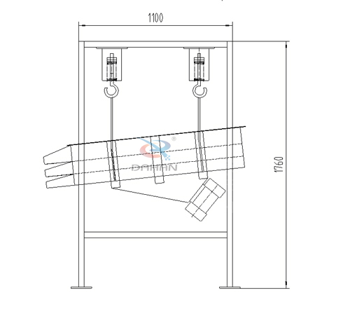 吊挂式直线振动筛分机为双振动电机驱动。当两台振动电机做同步、反向旋转时,其偏心块所产生的激振力在平行于电机轴线的方向相互抵消,在垂直于电机轴的方向叠为一合力,因此筛机的运动轨迹为一直线。两电机轴相对筛面在垂直方向有一倾角,在激振力和物料自重力的合力作用下,物料在筛面上被抛起跳跃或向前作直线运动,从而达到对物料进行筛选和分级的目的。