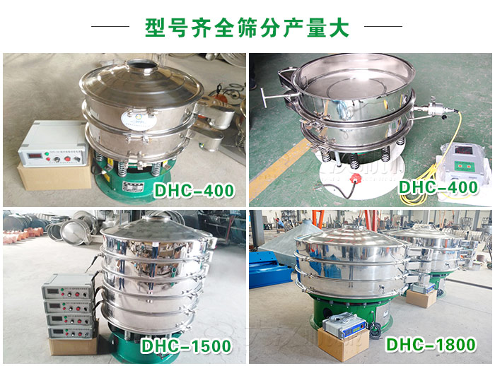 超声波旋振筛型号齐全产量大,型号有DHC-400、DHC-600、DHC-800、DHC-1000、DHC-1200、DHC-1500、DHC-1800、DHC-2000等,材质可选择不锈钢、碳钢材质。还可根据不同需求特殊定制(加高加缘、安装进料斗等)。相同型号产量比普通旋振筛产高10-15倍。