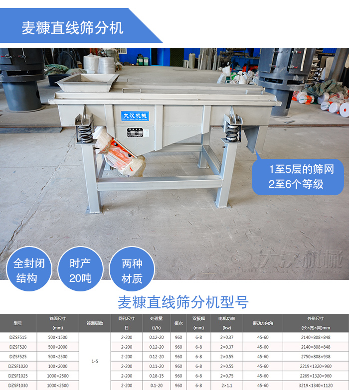 麦糠直线筛分机主要用于大产量筛分工作中,每小时筛分产量可达20吨,不同的型号满足不同产量的筛分要求,1至5层的筛网安装能同时将麦糠进行2至6个等级的筛选、分级,杂质、粗料自动化排出,全封闭结构,无粉尘溢散,材质有碳钢(Q235)不锈钢(304、316),是一台大产量筛分设备。